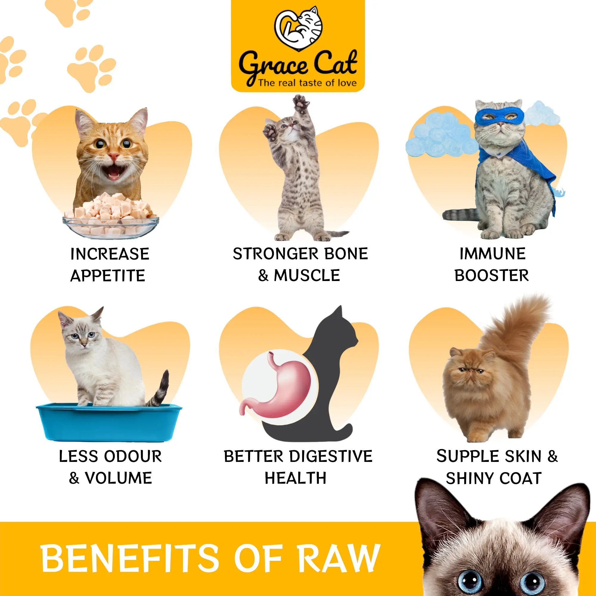 Freeze-drying involves freezing Grace Cat’s well chosen raw ingredients to -40ยฐC right at the peak of their freshness, then removing the moisture content under high pressure and thus prevents bacteria growth. This keeps natural nutrients, enzymes and flavour of the raw ingredient itself intact. GraceFull RAW is shelf-stable raw food and ready-to-serve without hassle or mess!