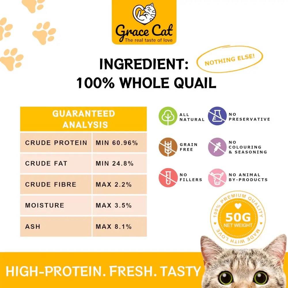 High quality freeze-dried quail is not easy to find and Iโm glad Grace Cat has it. My two cats enjoy it very much.