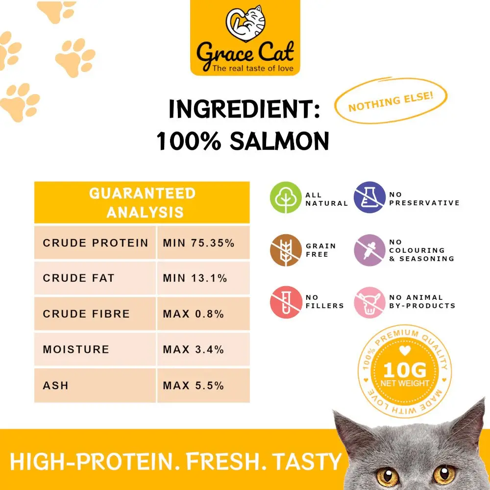 My kitty normally doesn’t always enjoy salmon, but he enjoys Gracefull’s salmon either as treats or meal topper to increase appetite.